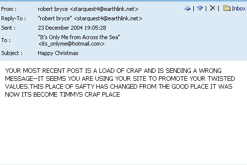 In the clear light of day, you might want to think about editing that piece down a bit. It's not exactly the kind of charitable and helpful writing style that young lurkers on here are going to find welcoming. In fact, it made even me feel rather uncomfortable: not what I hope for in "A Place of Safety".