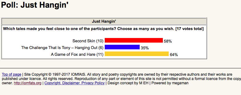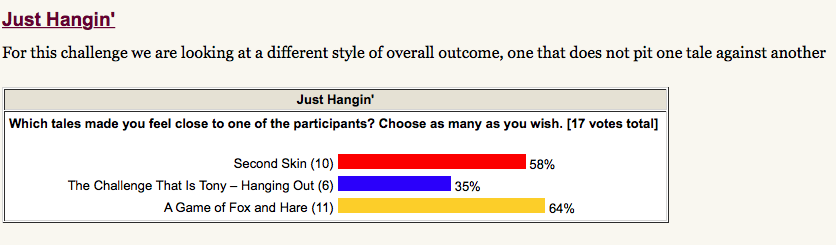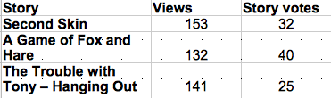 That seems not to be the case from the figures above, otherwise Second Skin would have more votes cast as would The Trouble with Tony - Hanging Out. Or is A Game of Fox and Hare somehow extraordinary in that it has attracted a greater proportion of votes? It's well written and imaginative, yes, good quality, yes, but so are the other two. They are just all differently well written and imaginative.