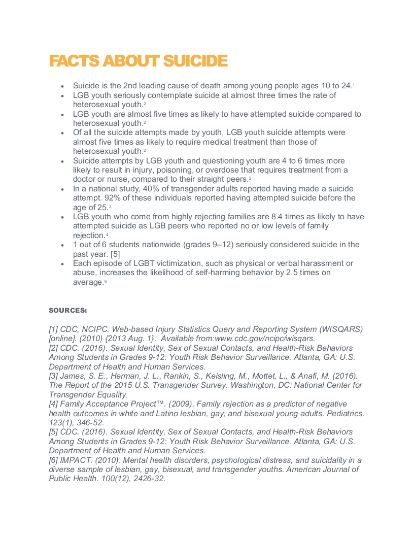 The Trevor Project fact sheet, with references, is attached. Any readers with knowledge in this area are encouraged to share and comment!