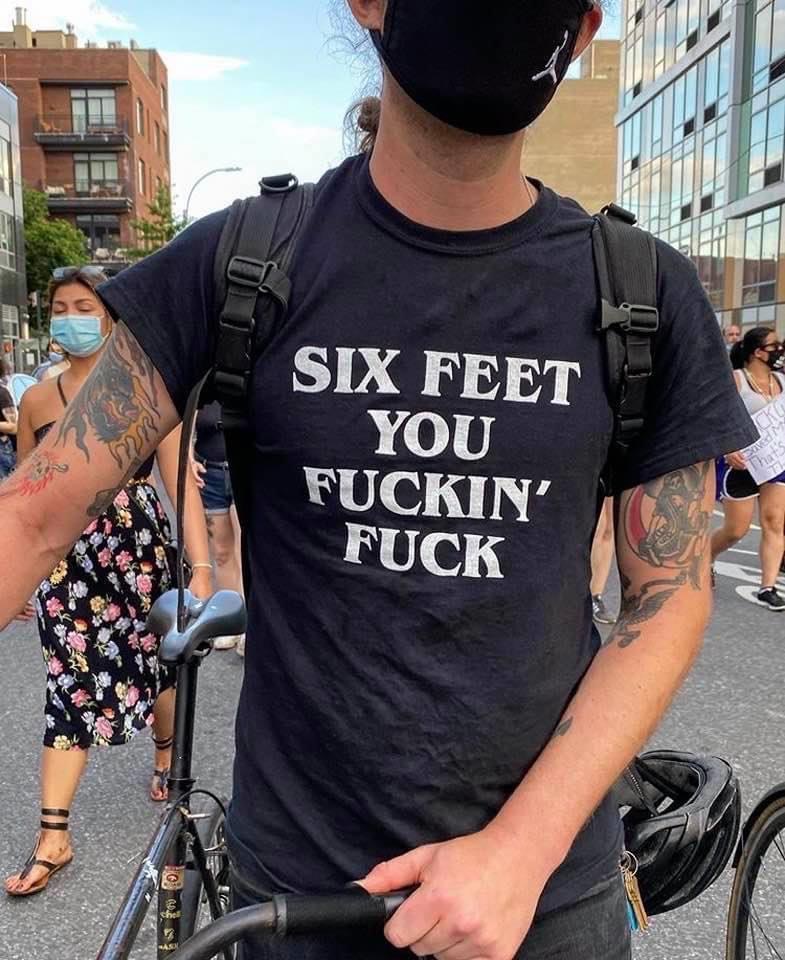 Isn't there something a little off with this message? Keeping a certain distance apart is when you don't wear a mask. The idea being that projected virus particles fall to earth before coming into contact with another person. Wearing a mask prevents these particles escaping into the air in the first place, so you could be standing next to someone.