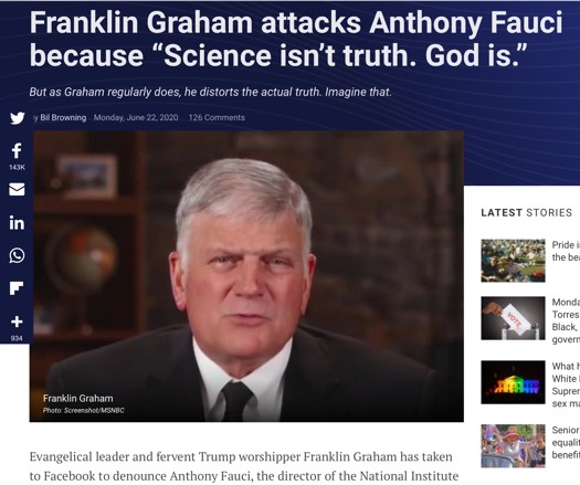 Shortly thereafter, Franklin Graham went after him with the outlandish assertion that "Science isn't truth. God is!" Graham makes the case for why so many Americans have an anti-science bias. And, of course, this from one of the main mouthpieces on those against LGBTQ rights!