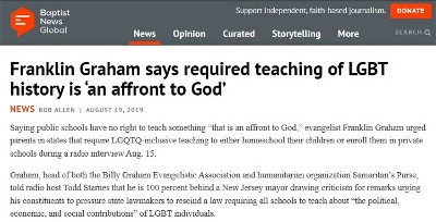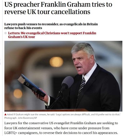 Most recently, as reported by The Guardian, as a result of strong push back from LGBTQ groups in the UK, Graham was forced to cancel his tour of "crusades" for May of this year. Thanks for strong LBGTQ voices in the UK, and a sensible religious response!