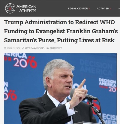 Maybe you've heard recently that Trump announced he was canceling financial support for the World Health Organization (WHO) right in the middle of the COVID-19 pandemic. Well, today we get this piece of reporting from American Atheists!