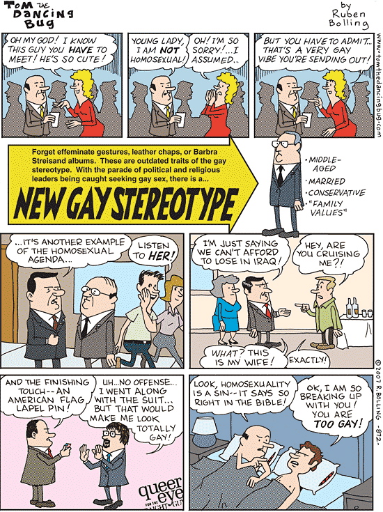 Tom the Dancing Bug is a weekly comic strip by Ruben Bolling which presents critical commentary on modern life, current events, and conventional wisdom and clichés. (There are no bugs or dancing involved and there are no characters named Tom.) The strip is carried in both mainstream and "alternative" papers, as well as on Salon.com. The strip frequently includes sociopolitical satire, often critical of conservative politicians.