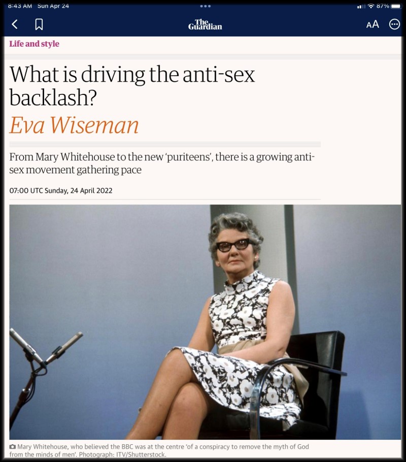 Meanwhile, in England the battle seems to take the form of an anti-sex movement and return to puritan mores, and the driver is Mary Whitehouse.